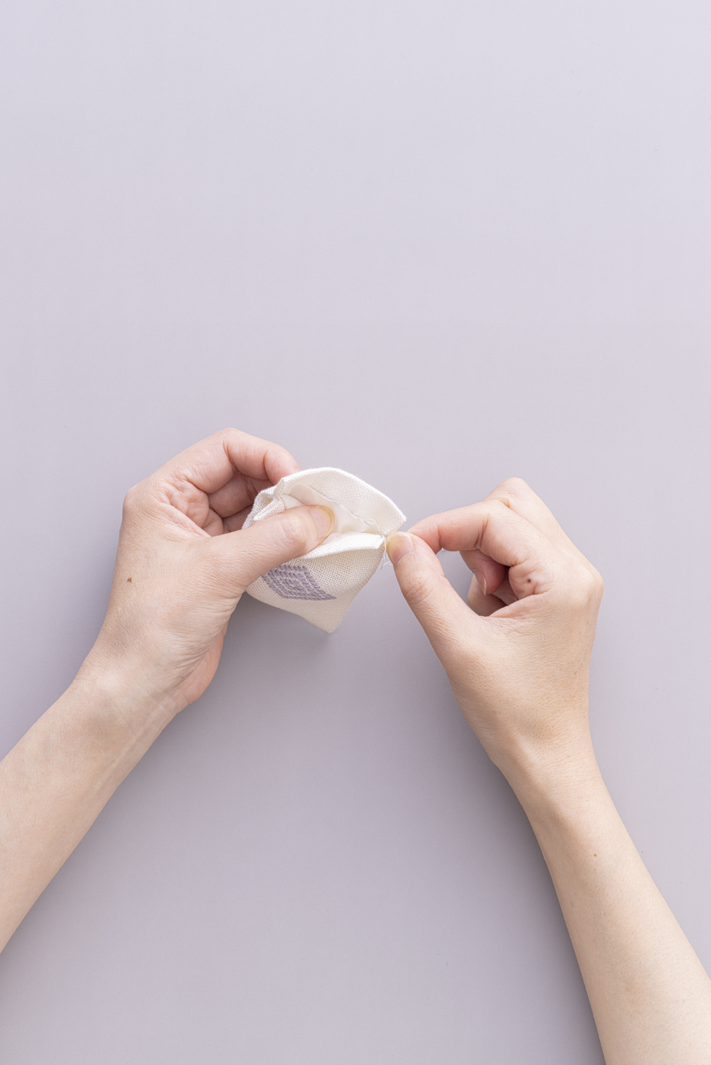• Das Futter in das Säckchen stecken und an der Umschlagkante festnähen.