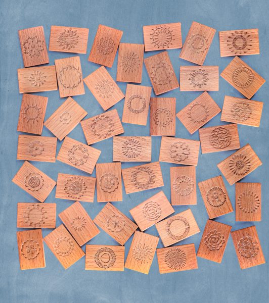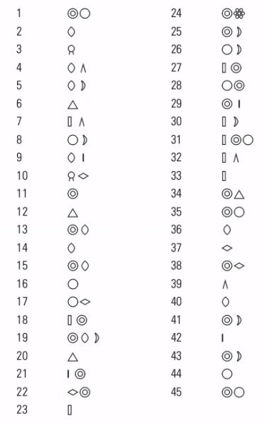 Unten abgebildet sind die Meißelmotive, welche den Motiven der obigen Holzstücke entsprechen. Die Nummerierung beginnt in der oberen linken Ecke mit Nummer 1 und verläuft nach unten rechts bis Nummer 45.
