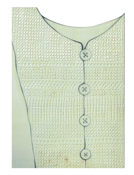 Hier diente eine sehr aufwendig bestickte Jacke als Inspirationsquelle. Da eine genaue Kopie des Musters in seiner Feinheit nicht möglich war, wurde das detailreiche Muster auf seine wesentlichen, charakteristischen Merkmale reduziert.