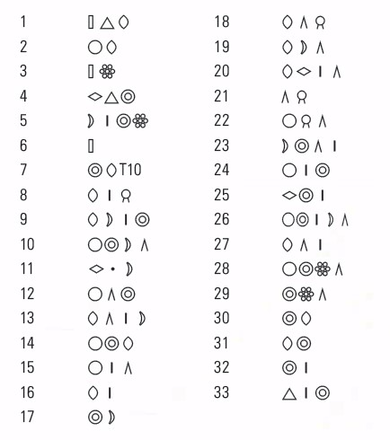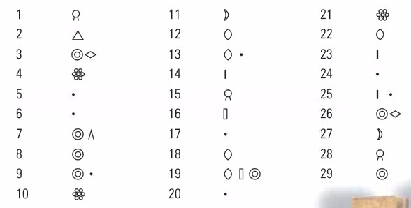 Die unten abgebildeten Meißelmotive entsprechen den obigen Wäscheklammern. Die Nummerierung beginnt in der oberen linken Ecke mit Nummer 1 und verläuft nach unten rechts bis Nummer 29.