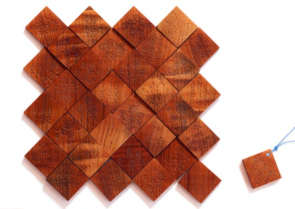 Die quadratischen Holzkärtchen, die aus Kirschbaumholz gefertigt und mit Leinöl behandelt wurden, eignen sich perfekt für eine individuelle Gestaltung als Spiel, Schmuck oder Anhänger. Sie können aber auch als Archiv und Inspirationsquelle für verschiedene Blumenformen dienen. Mit nur wenigen geometrischen Meißelformen können Sie eine Pflanze arttypisch nachempfinden.