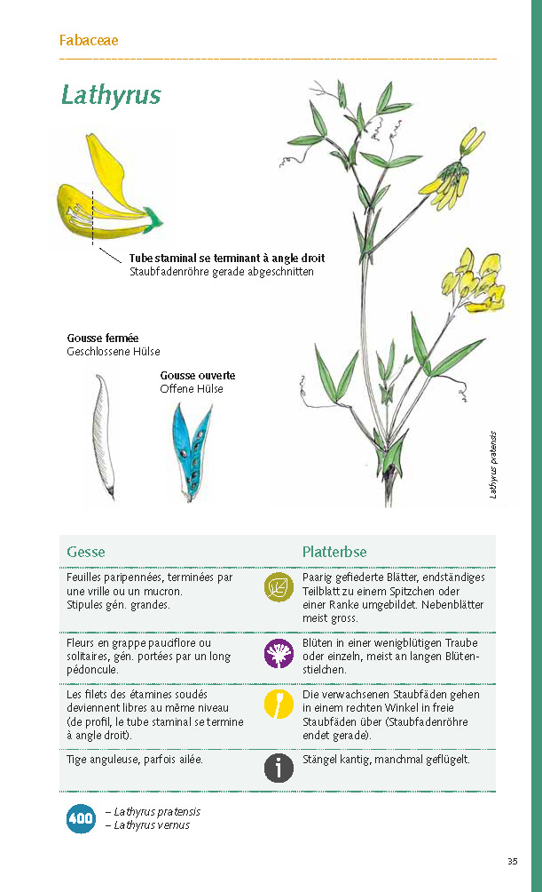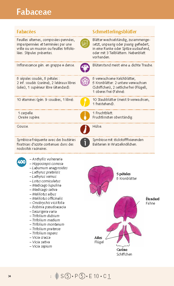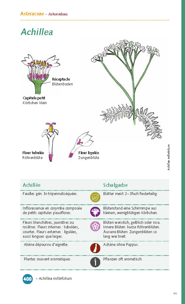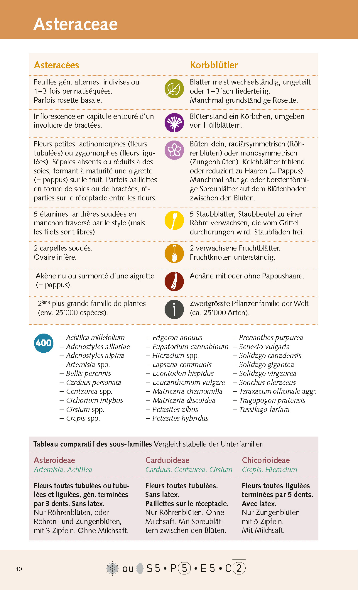 Das zweisprachige Büchlein stellt auf Deutsch und Französisch die wichtigsten Merkmale aller Pflanzenfamilien vor, zu denen die 400 zu lernenden Arten gehören. Es bietet den Leser:innen also insofern eine Hilfe, als dass es zu einer besseren Übersicht und einer systematischeren Artbestimmung verhilft: Denn wenn man erst einmal sicher weiß, zu welcher Pflanzenfamilie eine zu bestimmende Pflanze gehört, so ist es einfacher, sie auf Gattungs- und Artniveau zu bestimmen. Das hier vorgestellte Buch ist also eine Art «Feldbotanik ultra light».