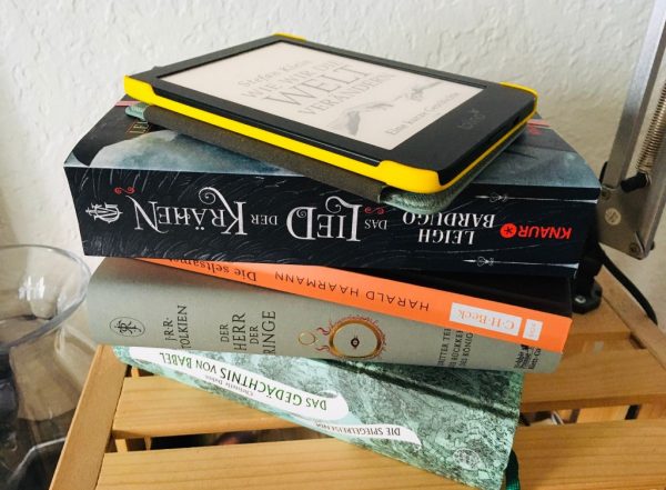 In meinem Rucksack ist eigentlich immer eins dabei (dazu manchmal mein Tolino, falls ich auf das andere Buch mal keine Lust habe..), eins auf dem Wohnzimmertisch und oft auch auf dem Sofa. Momentan ist mein Rucksackbuch Band 3 der Spiegelreisenden-Saga. Bei meinem Sofa liegt eine schöne Ausgabe von Der Herr der Ringe, die ich mal wieder lese und auf dem Tolino lese ich momentan das Sachbuch Wie wir die Welt verändern. Ich mag den Mix aus Sachbuch und Roman bzw. Fantasy.
