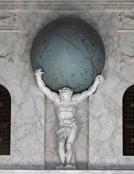 Eine Atlas-Skulptur in Amsterdam (Atlas inside the royal palace, Amsterdam, Netherlands). Jacob van Campen,1655. https://www.paleisamsterdam.nl/en/discover-palace/atlas/ ©Wikimedia Commons