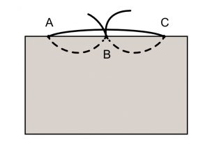 7. Faden in die Nadel einfädeln. Er muss ca. 2,5-mal länger sein als die Buchhöhe. Von außen nach innen heften. In Loch B einstechen und in Loch C ausstechen, den Faden entlang des Heftrückens laufen lassen. Dann in Loch A ein- und in Loch B wieder ausstechen. Den Faden abschneiden. Darauf achten, dass die Fadenenden auf jeder Seite des langen Stiches auf dem Rücken liegen. Den Faden nun stramm ziehen, aber nicht so fest, dass das Papier reißt. Die Enden mit einem Doppelknoten sichern.
