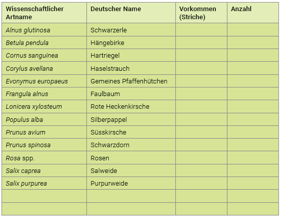 Die Bäume und Sträucher am Ufer des Sagentobelbachs wurden gepflanzt. Wurde dabei ein naturnahes Verteilungsmuster gewählt? Gehen Sie die Fließstrecke von der Brücke bis zur Straßenunterquerung ab und bestimmen Sie soweit möglich alle Bäume und Sträucher (über 50 cm Höhe), entweder an beiden Ufern (falls Sie die Bäume und Sträucher aus der Entfernung erkennen können) oder nur am linken Ufer. Machen Sie in der nachfolgenden Tabelle für jedes Vorkommen einer Art einen Strich. Achten Sie auch auf die räumliche Verteilung. Zu welchem Schluss kommen Sie?