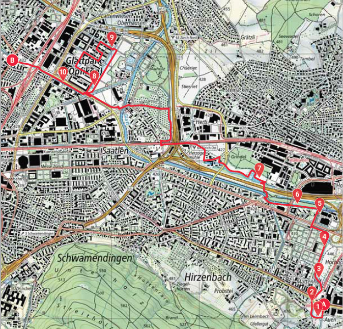 Die Exkursion, die wir Ihnen hier im Folgenden in Teilen vorstellen, führt durch ein Siedlungs- und Gewerbegebiet am Nordrand der Stadt Zürich. Das Gebiet wurde in den letzten Jahren mit dem Ausbau von Wohnsiedlungen, Gewerbegebieten, Verkehrs- und Freizeitanlagen baulich stark verdichtet. Zur Verminderung negativer Auswirkungen auf die Lebensqualität, das lokale Klima, den Wasserhaushalt und die Biodiversität wurde im Zuge der Urbanisierung auch die blau-grüne Infrastruktur ausgebaut. Dazu wurden bestehende Lebensräume ökologisch aufgewertet und vernetzt. Zudem wurden neue, künstliche blau-grüne Strukturen geschaffen.