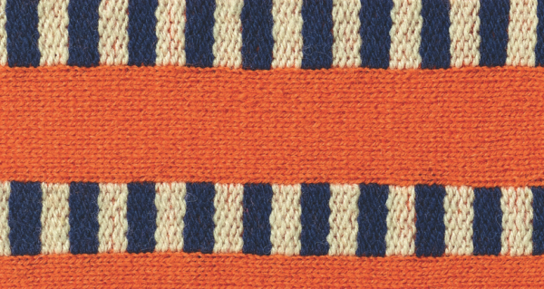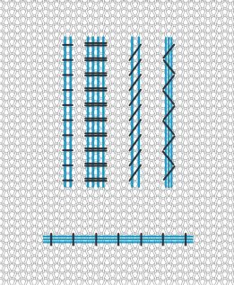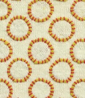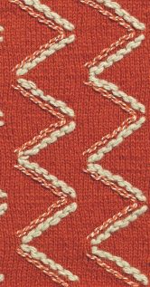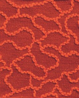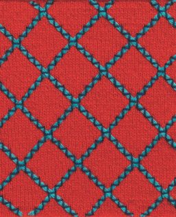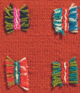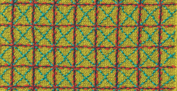Bei diesem Muster scheinen Spannstiche mehrere Reihen Garn auf dem Gestrick zu fixieren. Doch zunächst werden dafür kleine Spannstiche in regelmäßiger Anordnung gestickt. Danach zieht man unter den Stichen mehrere Reihen Garn hindurch, ohne das Gestrick zu durchstechen.