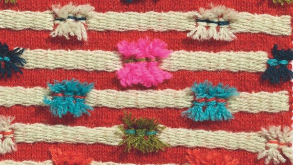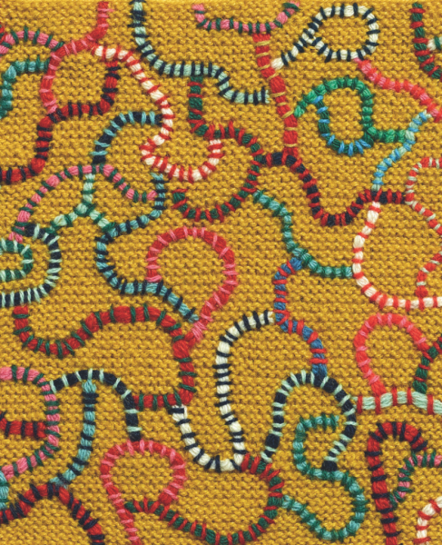 Für die nachfolgenden Reliefmuster wurden als Grundlage Knüpfstiche eingesetzt (Schlaufen mit Pappschablone arbeiten) und die Schlaufen dann aufgeschnitten. Um die Muster zu beleben, wurden Wechselstiche (siehe Seite 99 im Buch – hier im Beitrag ZWEITES BEISPIEL) in anderen Farben dann über oder dicht neben die Quasten der Knüpfstiche gestickt.