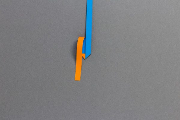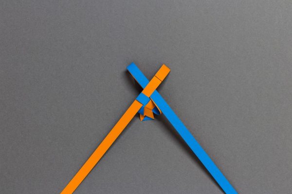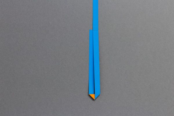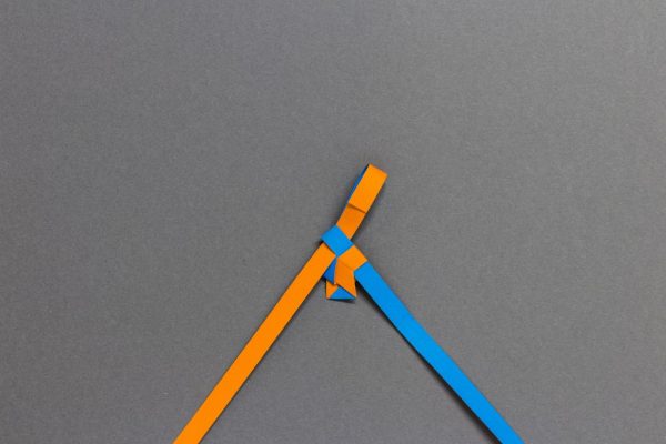 - Das rechte Pfeilspitzenelement vornüberfalten und zunächst nach links, anschließend hinter der ganzen Arbeit nach rechts führen.