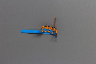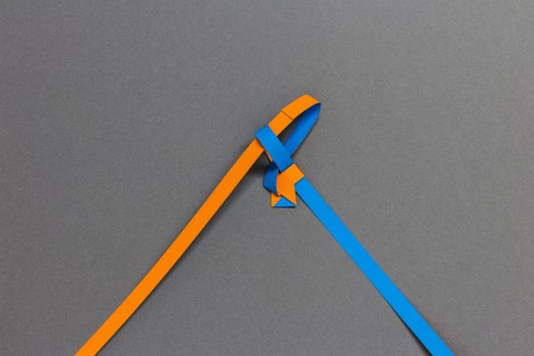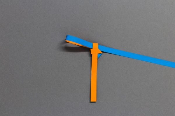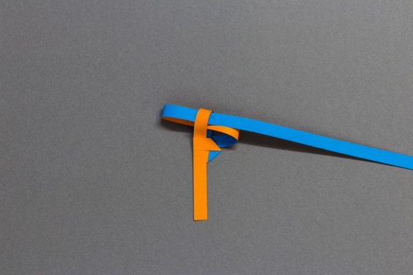 - Mit dem blauen Streifen rechts wieder eine neue Schlaufe bilden und durch die links wartende orangefarbene Schlaufe führen.