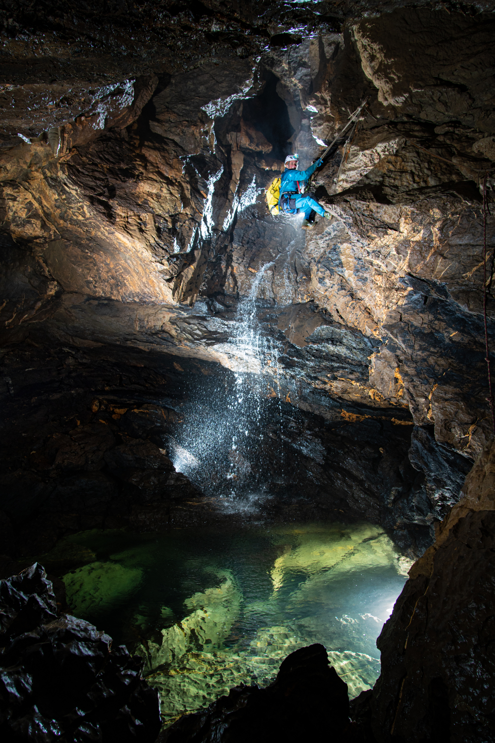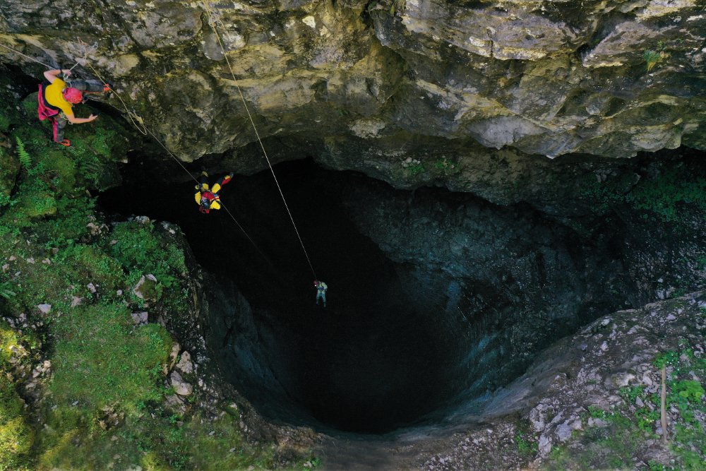 Ins Häliloch (BE) geht es 100 m gerade hinunter. An einem einzigen Seil über dem Schlund hängend fühlt man sich als Forscher winzig klein. © Rémy Wenger