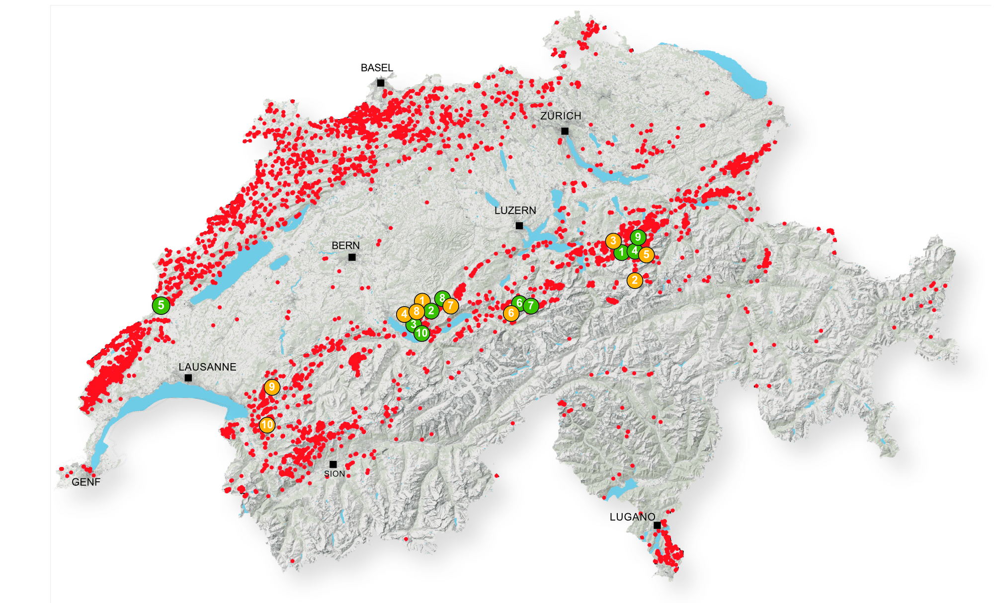 Die derzeit 11.765 Höhlen (Stand Oktober 2023), die in der Schweiz erfasst sind, verteilen sich über die Karstgebiete der Schweiz. Auf der folgenden Karte sind die 11.765 je mit einem roten Punkt eingezeichnet. Besonders hervorstechen die längsten (grüner Punkt) und tiefsten Höhlen (gelber Punkt).