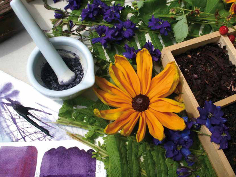 Ich lernte auch schon als Kind durch meine Großmutter, dass in einigen Pflanzen viele leuchtende Farbstoffe stecken. In der Osterzeit färbte sie mit mir zusammen die Eier und ich half ihr, Walnuss- und Zwiebelschalen zu sammeln und einzuweichen. Durch sie lernte ich auch die Farbkraft der schwarzen Stockrosenblüten kennen. Oft warf sie nämlich zu meiner Freude ein paar getrocknete Blüten in mein Trinkwasser, um es damit wunderschön purpurrot einzufärben. Das hat mich als Kind so sehr fasziniert, dass ich eines Tages probierte, mit eben diesem Farbwasser zu malen.