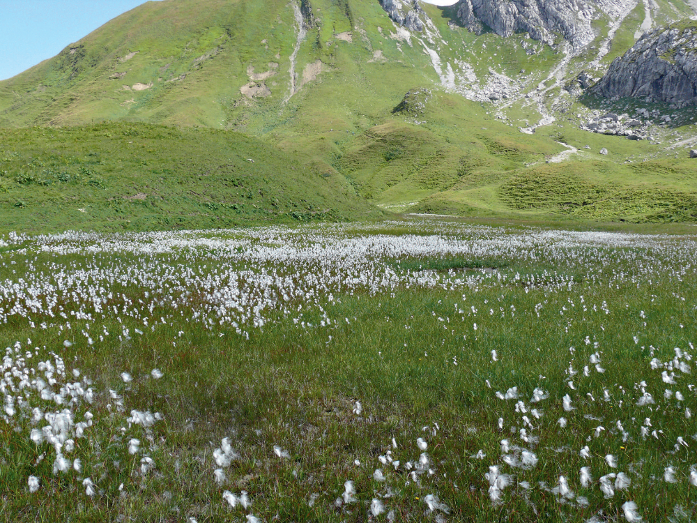 Alpines Kalkflachmoor (Verlandungsmoor eines Karsees) mit Eriophorum scheuchzeri und E. latifolium, Schrecksee, Allgäuer Alpen, 06.09.2013. Foto: Andreas Fleischmann.