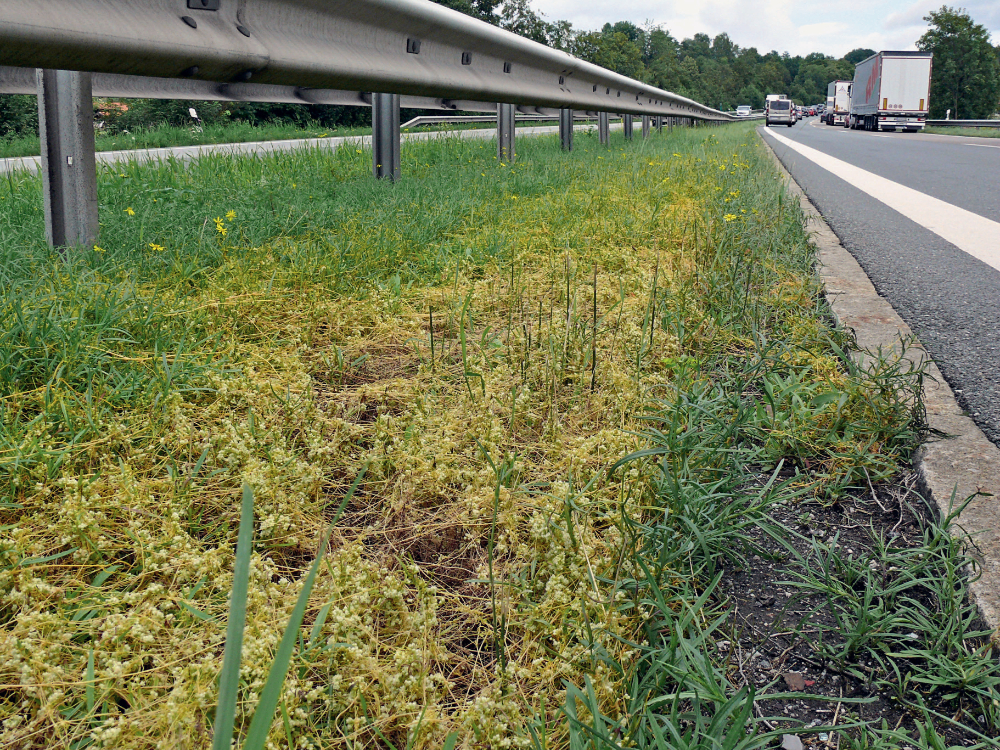 Salztolerante Ruderalvegetation am Autobahnmittelstreifen, hier Cuscuta campestris parasitierend auf Senecio inaequidens, A8 bei Frasdorf, Chiemgau, Oberbayern, 22.07.2024.
