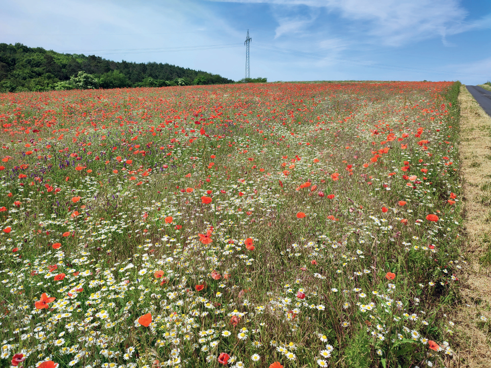Ackerbrache im Vertragsnaturschutz, mit Papaver rhoeas, Anthemis austriaca, Vicia glabrescens u. a., Karlstadt, Unterfranken. 15.06.2021. Foto: Marcel Ruff.