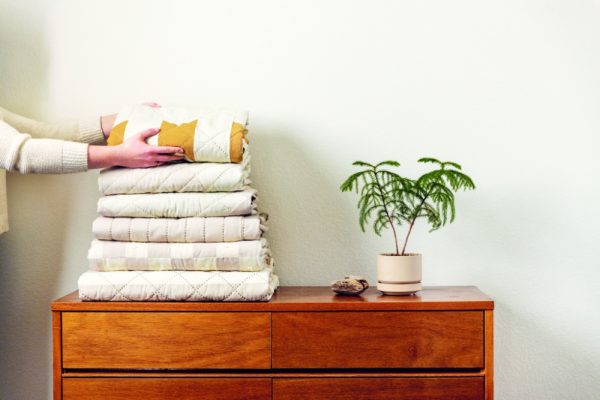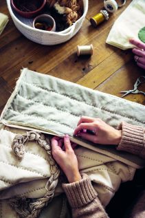 Die offenen Schnittanten eines Quilts nach dem Quilten mit einem Stoffstreifen versäubern. Meist der letzte Schritt beim Herstellen eines Quilts.