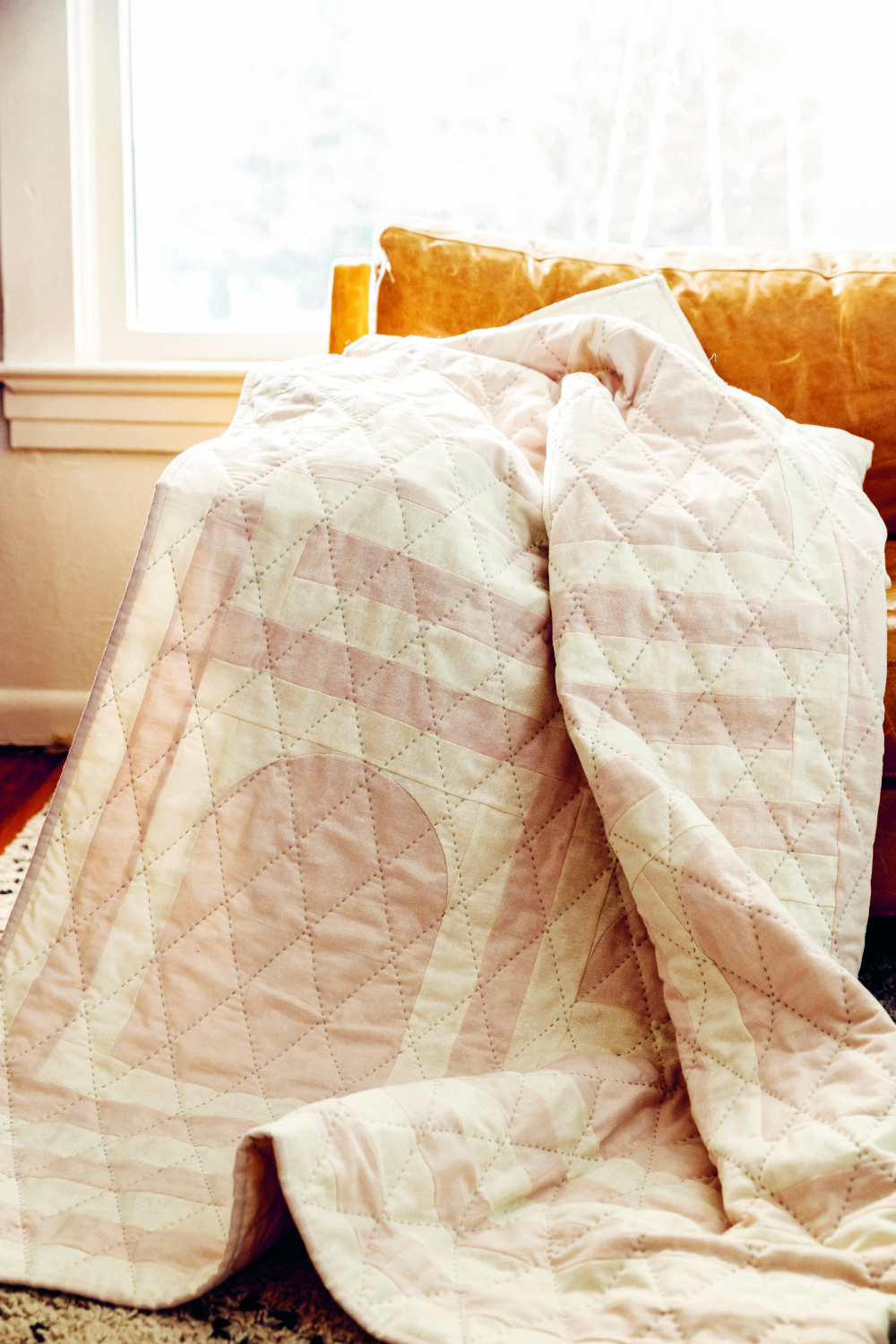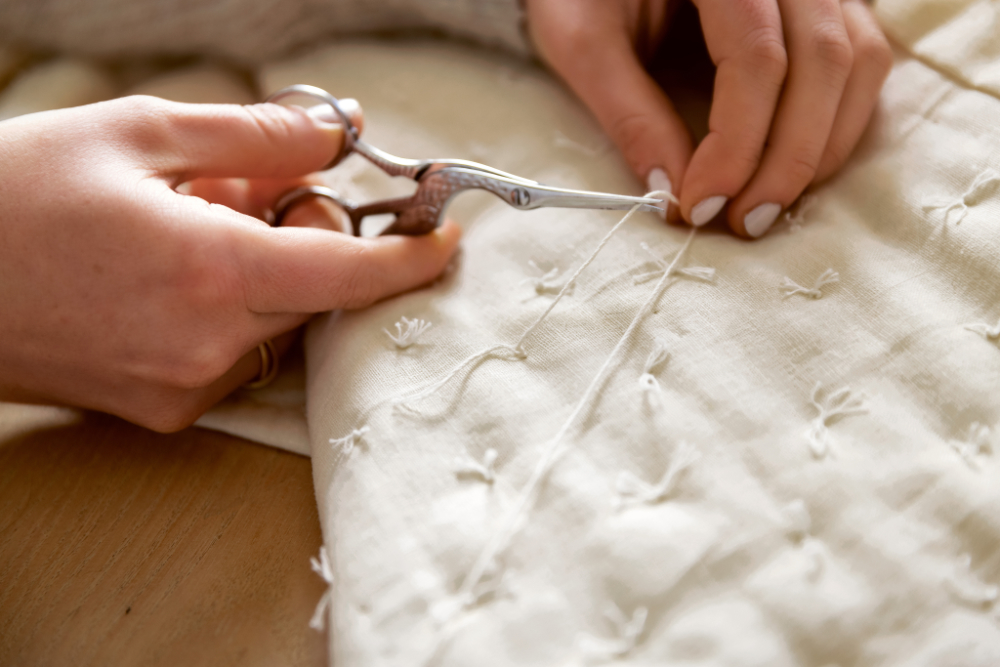 Alle Lagen eines Quilts dauerhaft zusammenheften wie durch Vorstiche oder Knotenheftung.